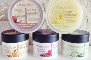 Απολεπιστικά προσώπου και σώματος από τη Donna Valente: banana miracle, tropical dream, cucumber & avocado, honey & almond και pomegranate & blueberry.